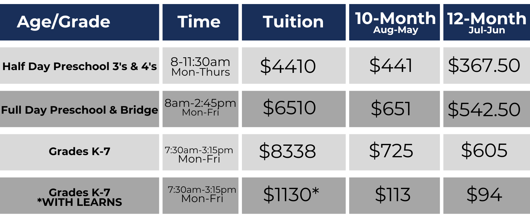 *2026-2027 Learns funding for K-7 = $7204 per child. This reduction in tuition is before any discounts are applied (church membership, multi-child).